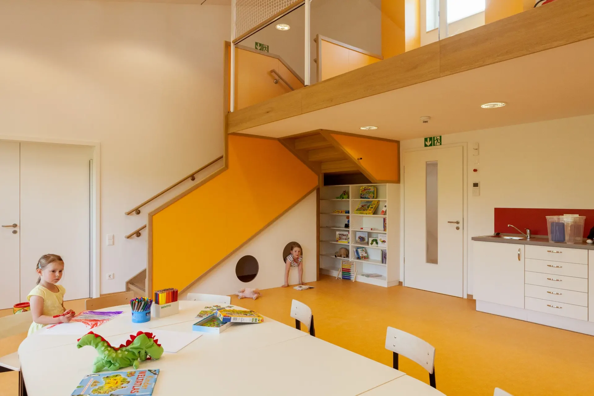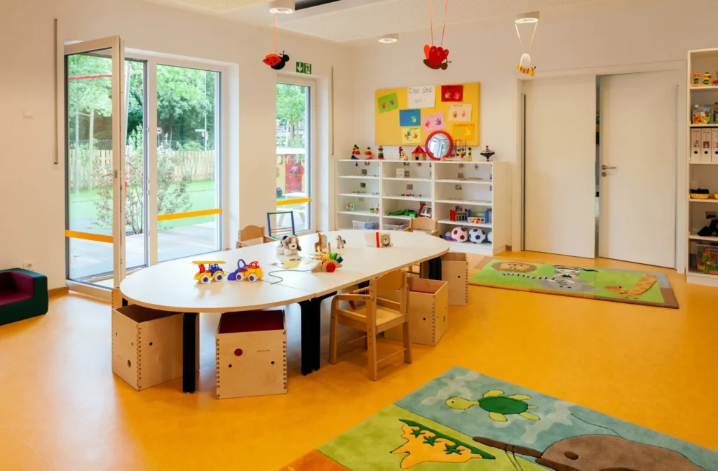 - Jede Gruppe mit eigenem Haupt- & Nebenraum, Nutzung des Nebenraums für Ruhezeiten & pädagogische Aktivitäten und bodentiefen Fenstern