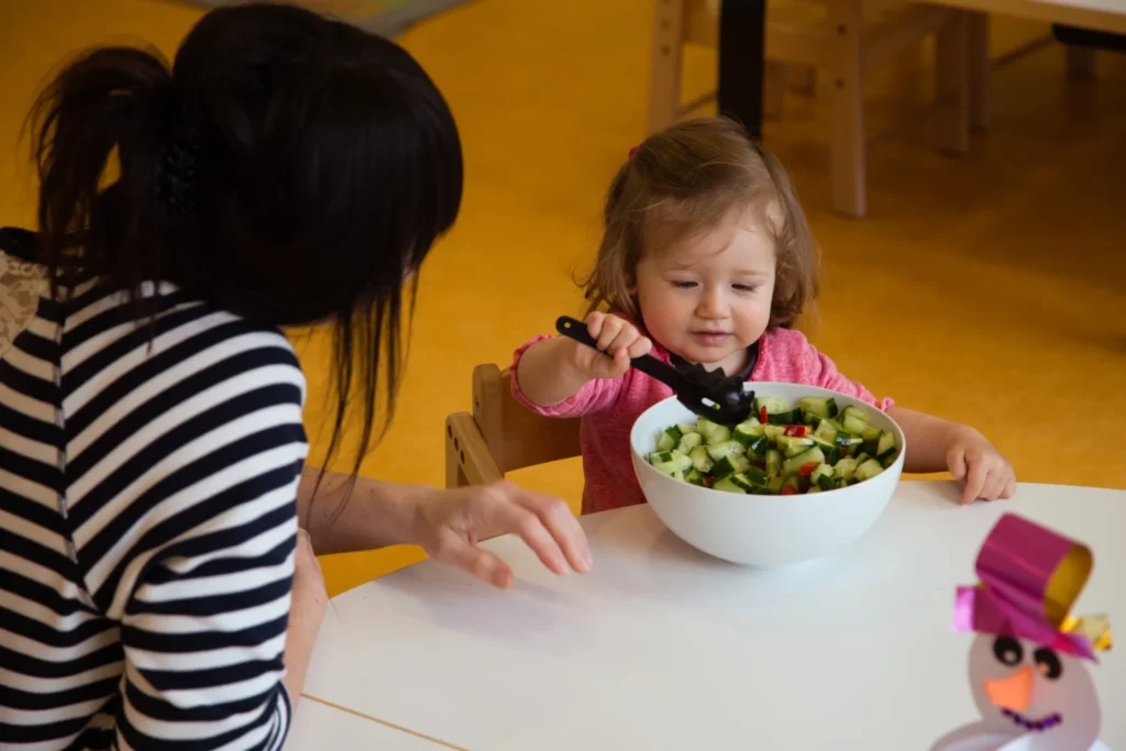 - Warmes Mittagessen von einem zertifizierten Anbieter für hochwertige Kinder- und Babynahrung, ergänzt durch frische Salate und Rohkost