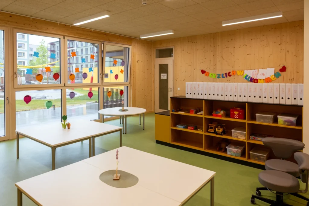 - Jede Gruppe verfügt über einen großzügigen Gruppenraum. Zudem teilen sich jeweils eine Krippen- und eine Kindergartengruppe einen an den Gruppenraum angrenzenden Multifunktionsraum