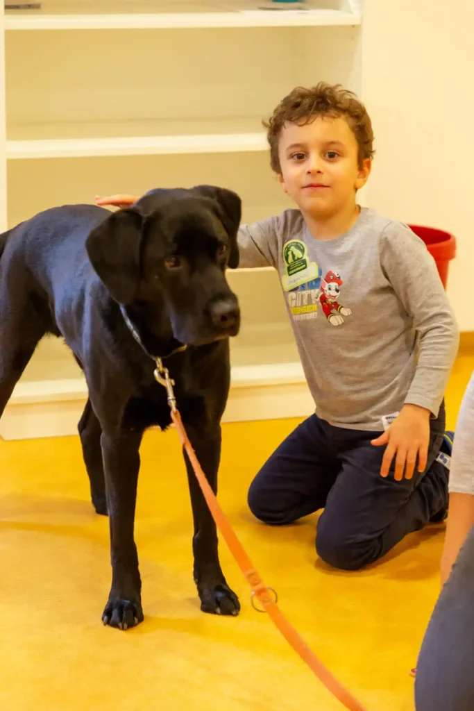 Wie begrüße ich einen Hund richtig? Wo mag er gestreichelt werden? Im MINIHAUS lernen die Kinder mit den Mensch-Hund-Teams der Initiative „Helfer auf vier Pfoten“ spielerisch den respektvollen Umgang mit Hunden.