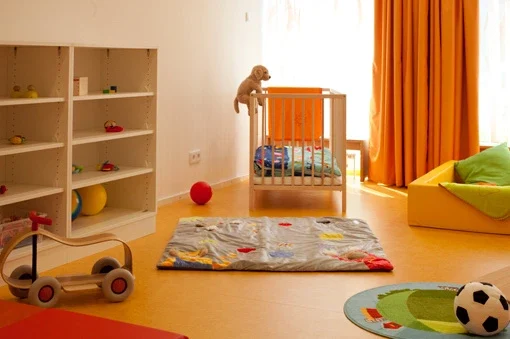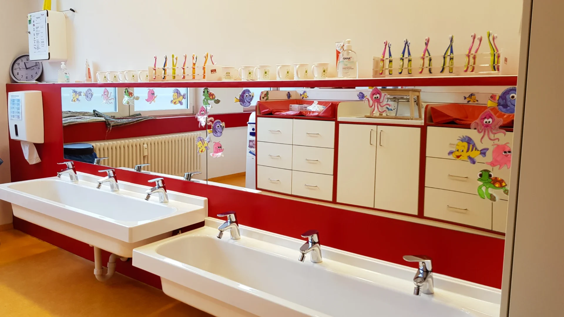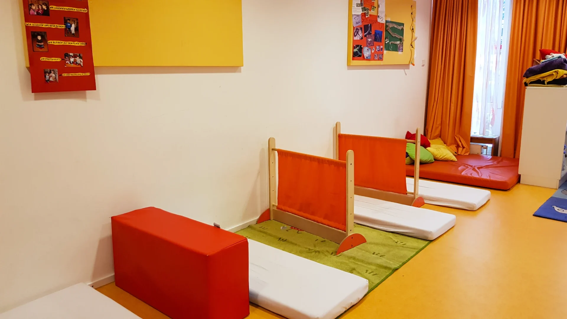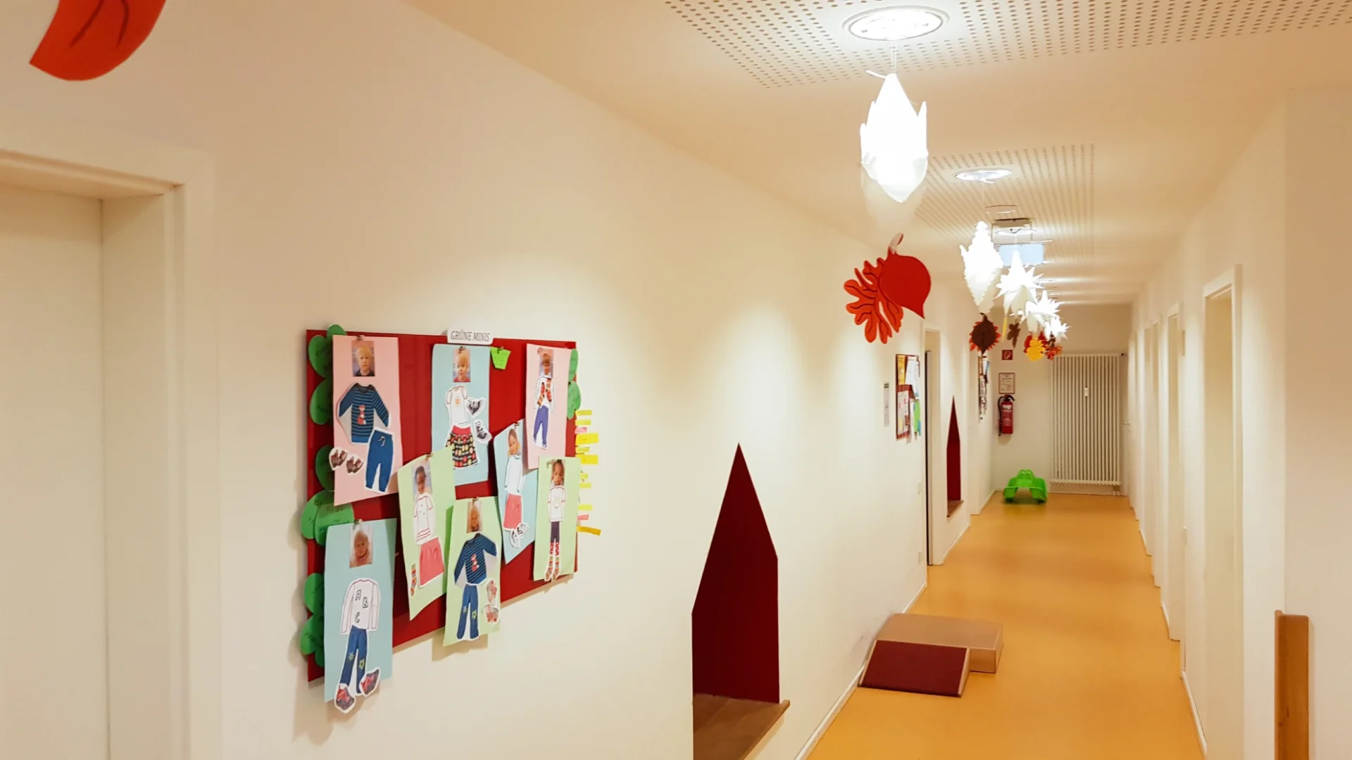 - Jede Gruppe mit eigenem Haupt- & Nebenraum, Nutzung des Nebenraums für Ruhezeiten & pädagogische Aktivitäten und bodentiefen Fenstern