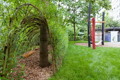- Lebendig gestaltetes und lärmgeschütztes Außengelände