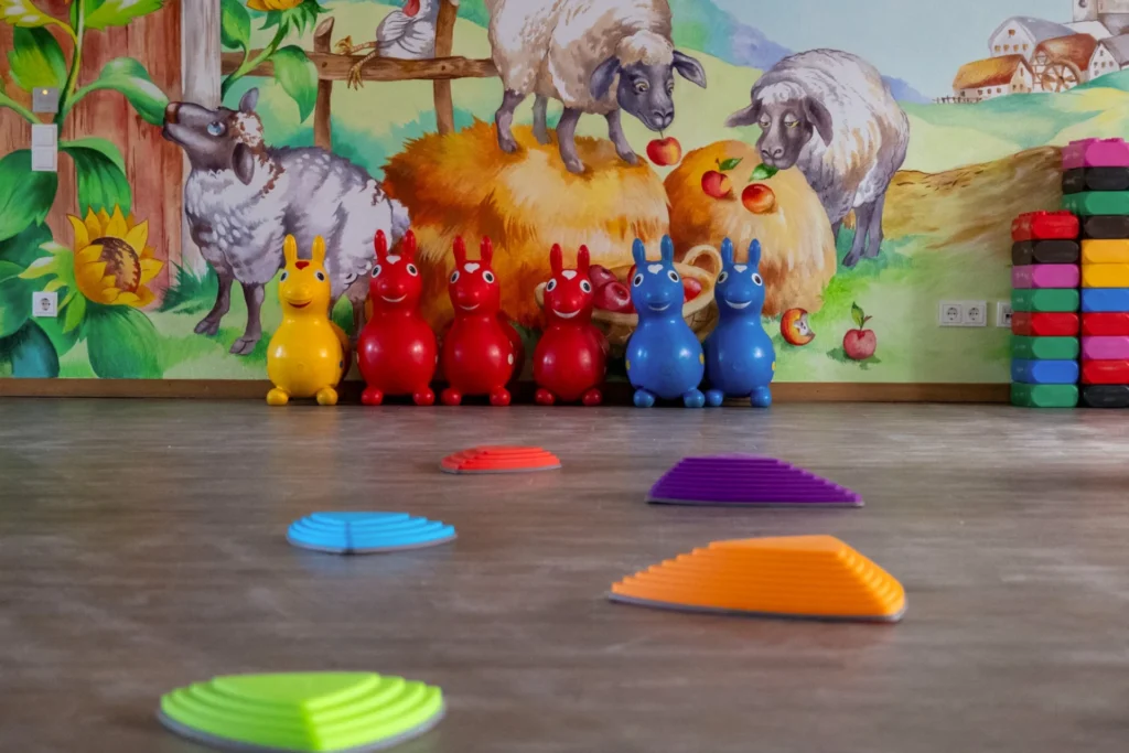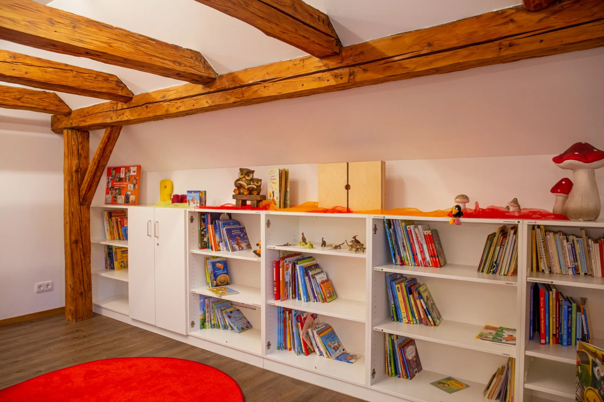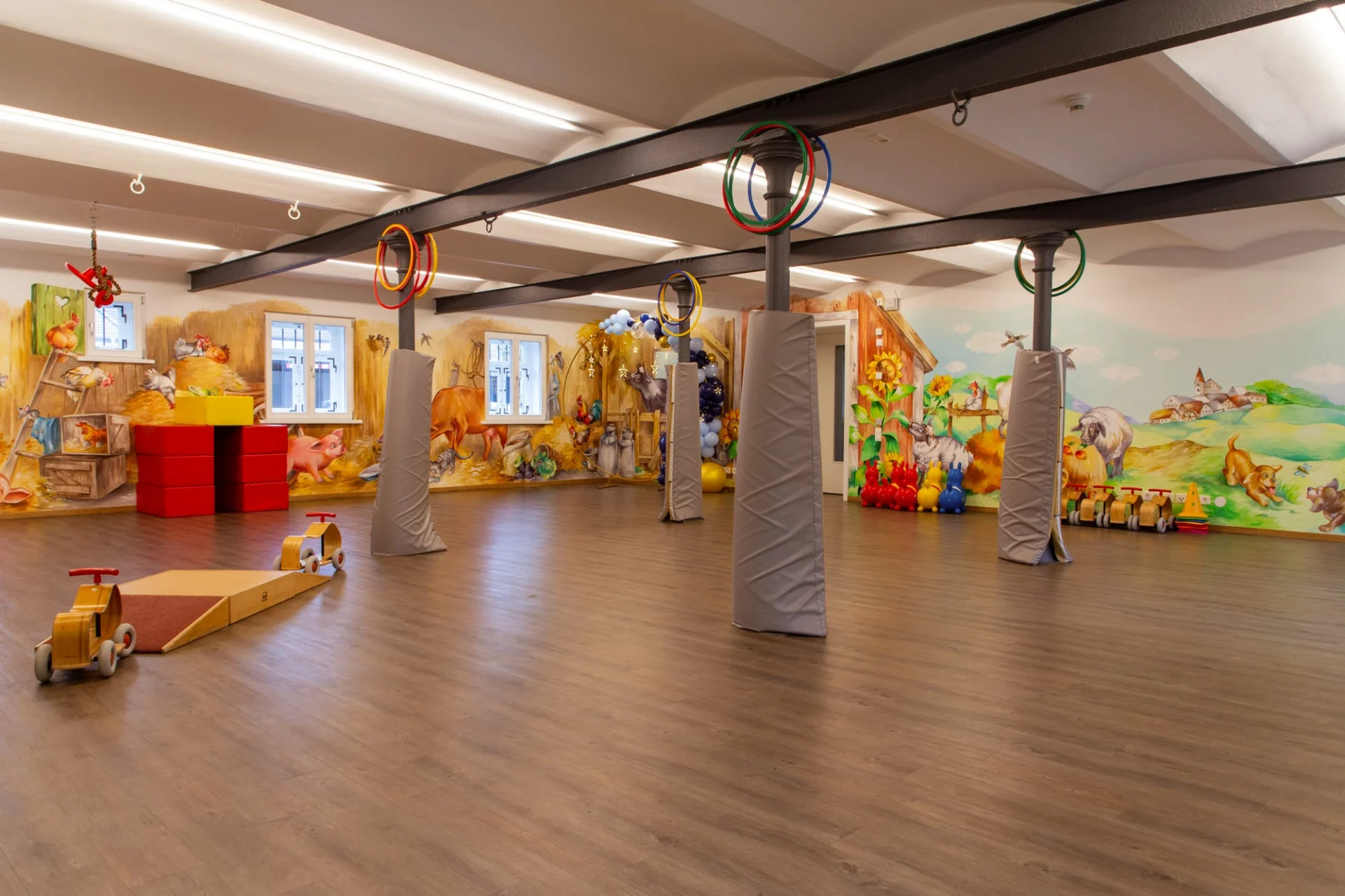 - Jede Gruppe mit eigenem Haupt- & Nebenraum, Nutzung des Nebenraums für Ruhezeiten & pädagogische Aktivitäten und bodentiefen Fenstern
